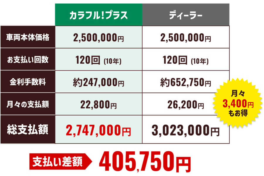 「買った後の維持費」で他店に大差をつけるのがカラフル流。トータルコストで圧倒的な差が出ます!